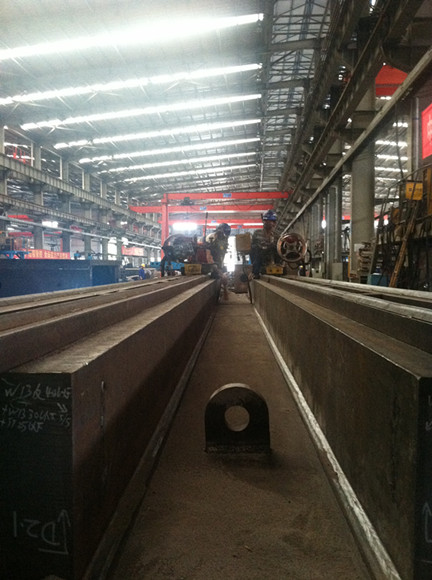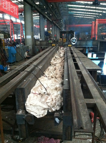 構(gòu)件采用定位焊,焊前預(yù)熱溫度不低于120℃。焊接時(shí),嚴(yán)格控制焊接熱輸入,長度方向上焊接方向一致,從中間向兩側(cè)對稱施焊,使用氣體保護(hù)焊+埋弧焊進(jìn)行焊接,首先用氣保焊在35°方向打底,用埋弧焊填充2-3層;翻身清根,清根后在45°側(cè)用埋弧焊填充,把35°側(cè)產(chǎn)生的變形完全抵消(即板變平)為止;然后翻身把35°側(cè)再填充2-3層;再翻身填充45°側(cè),把35°側(cè)產(chǎn)生的變形完全抵消(即板變平)為止;再翻身填充35°側(cè),以此下去直到蓋面。整個(gè)焊接過程歷時(shí)7天,共計(jì)168個(gè)小時(shí)不間斷焊接施工。構(gòu)件未發(fā)生變形,構(gòu)件外形尺寸符合現(xiàn)行GB50205-2001《鋼結(jié)構(gòu)工程施工質(zhì)量驗(yàn)收規(guī)范》;UT、磁粉檢查合格率均達(dá)到100%。