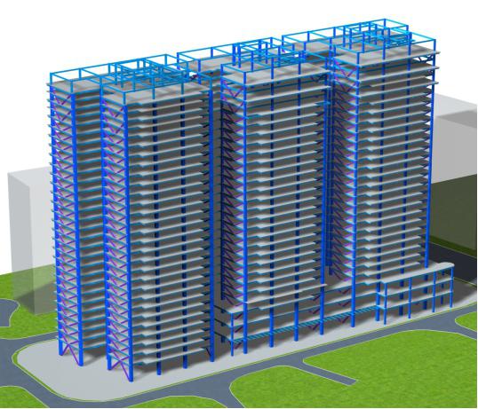 整個項目分為三個單元,1單元地下一層,地上27層;2單元和3單元地下一層,地上26層;采用鋼框架-中心支撐結(jié)構(gòu)體系。