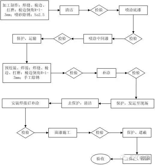 (10)構件經(jīng)工廠噴砂除銹合格后,噴刷完成底漆和中間漆。