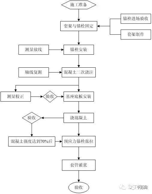 錨栓安裝前應在上套板上先標出軸線控制點和標高控制,然后固定中心,調(diào)整標高,并按要求臨時加固。
