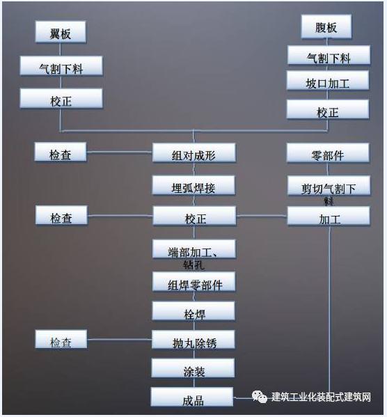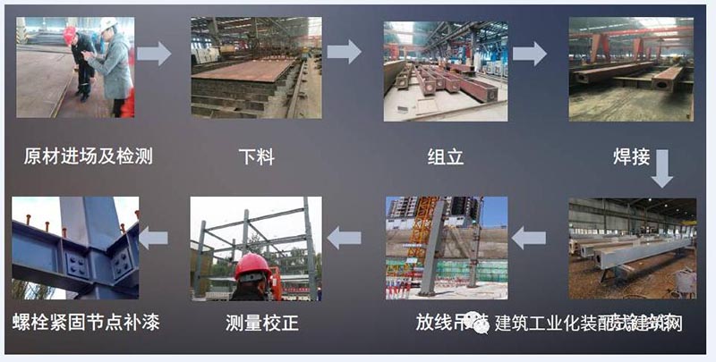 原材料進(jìn)場(chǎng)及檢測(cè)—下料—組立—焊接—螺栓緊固節(jié)點(diǎn)補(bǔ)漆—測(cè)量校正—放線吊裝—噴涂油漆。