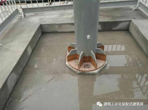 ▲ 在鋼柱安裝、調(diào)整后,采用二次灌筑法,將縫隙填實(shí)