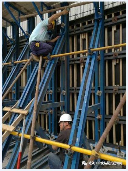 施工流程:先吊入角!跞胍粋(cè)模板、就位、調(diào)垂直度→穿拉桿→就位另一側(cè)模板→穿對(duì)拉螺栓,調(diào)整垂直度→處理節(jié)點(diǎn)(安裝模板連接器等、圍擋梁位等)。
