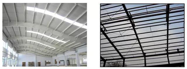1.門式剛架屋面體系的整體性可以依靠檁條、隅撐來保證,從而減少了屋蓋支撐的數(shù)量,同時支撐多用張緊的圓鋼做成,很輕便。