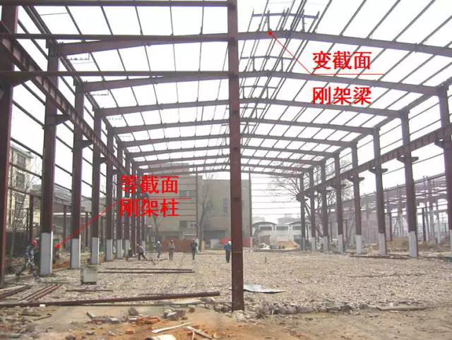 (3).當(dāng)廠房橫向跨度不超過15m,柱高不超過6m時,屋面剛架梁宜采用等截面剛架形式。當(dāng)廠房橫向跨度大于15m,柱高超過6m時,宜采用變截面剛架形式。