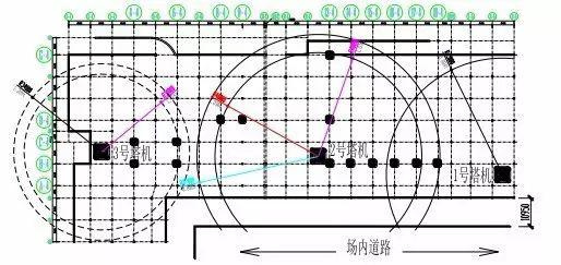 (1)本工程主體結(jié)構(gòu)的東、西兩側(cè)距作業(yè)點較遠(yuǎn),北側(cè)為場外道路并有一路高壓供電線路因此該三方向在施工中均無法使用。