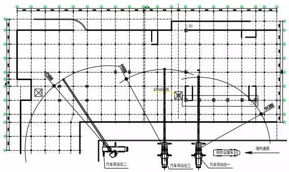 (1)汽車吊站位一:適用于各層鋼構(gòu)件的卸貨及 13-4軸至 18-4軸區(qū)域負(fù)一層至 4層鋼構(gòu)件轉(zhuǎn)運和吊裝。