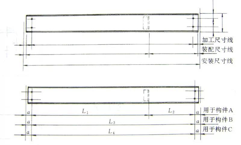 詳圖的尺寸由尺寸線、尺寸界線、尺寸起止點(diǎn)組成;尺寸單位除標(biāo)高以m為單位外,其余尺寸均以mm為單位,且尺寸標(biāo)注時(shí)不再書寫單位。一個(gè)構(gòu)件的尺寸線一般為三道,由內(nèi)向外依次為:加工尺寸線、裝配尺寸線、安裝尺寸線。當(dāng)構(gòu)件圖形相同,僅零件布置或構(gòu)件長(zhǎng)度不同時(shí),可以一個(gè)構(gòu)件圖形及多道尺寸線表示A、B、C!……等多個(gè)構(gòu)件,但最多不超過5個(gè)。