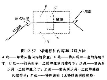 焊縫標(biāo)注方法,用單箭頭指向焊縫位置,然后畫出引出線和橫線(必要時(shí)在橫線末繪出尾部)。橫線上下標(biāo)注焊縫尺寸和焊縫間隙形狀,標(biāo)注在橫線以上時(shí),表示焊縫在箭頭一側(cè);標(biāo)注在橫線以下時(shí),表示焊縫在箭頭所指的反面一側(cè)。角點(diǎn)處可標(biāo)注部分焊縫的特點(diǎn),尾部可書寫焊縫的特殊說明。
