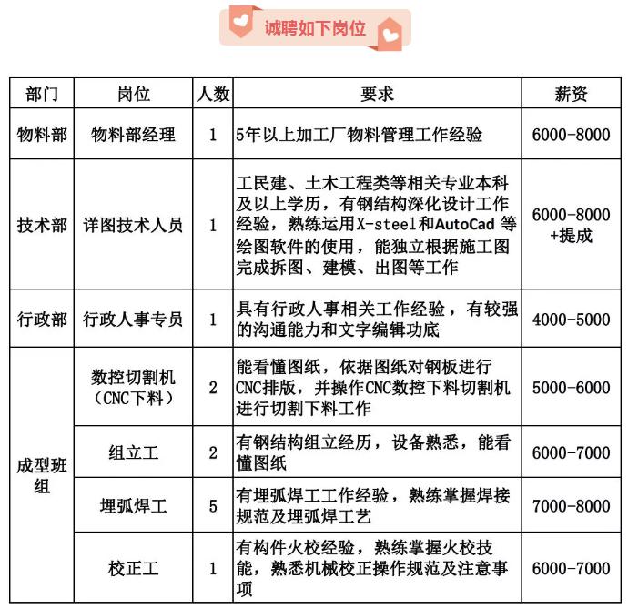 海南浙大鋼構(gòu)有限公司與海南省建筑產(chǎn)業(yè)化股份有限公司共同發(fā)起設(shè)立海南省海建鋼構(gòu)有限公司(暫定名)。工廠地址位于:老城經(jīng)濟(jì)開發(fā)區(qū)新興路。預(yù)計(jì)7月份進(jìn)行投產(chǎn),現(xiàn)誠聘以下崗位,期待你的加入!