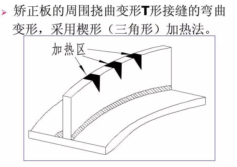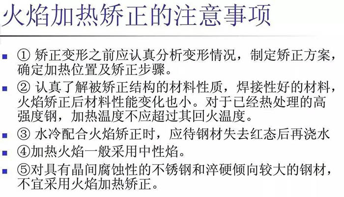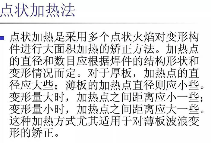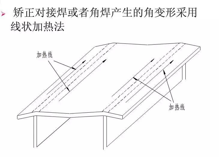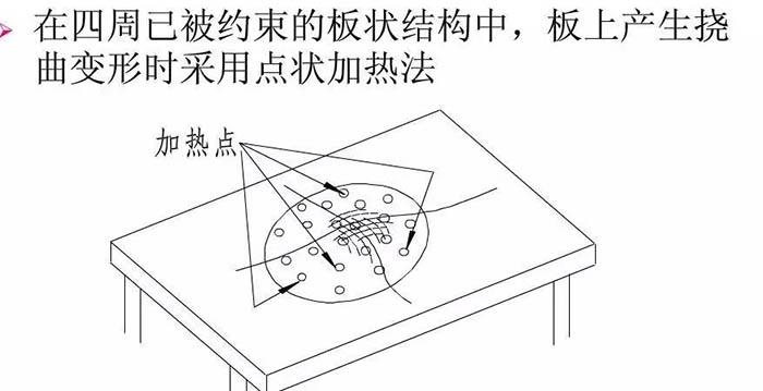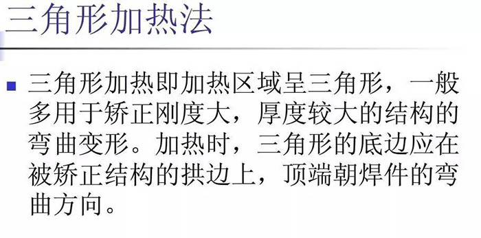 即利用不均勻的加熱使結(jié)構(gòu)獲得反向的變形來補(bǔ)償或抵消原來的焊接變形。加熱矯正法的加熱方法可分為點(diǎn)狀加熱、線狀加熱、三角形加熱。加熱矯正能消除很多施力矯正無法解決的變形,掌握火焰局部加熱引起的變形的規(guī)律是做好矯正的關(guān)鍵,決定火焰矯正效果主要是加熱的位置和加熱溫度。