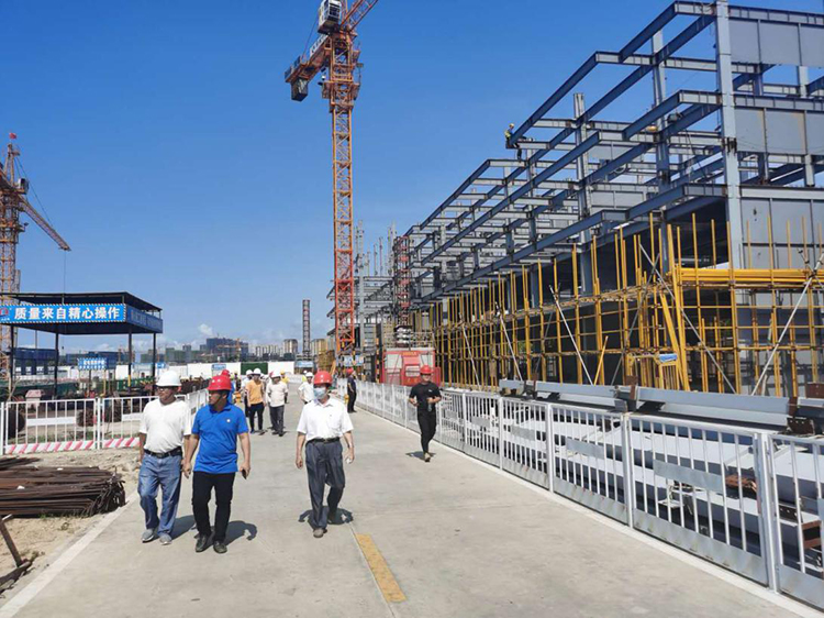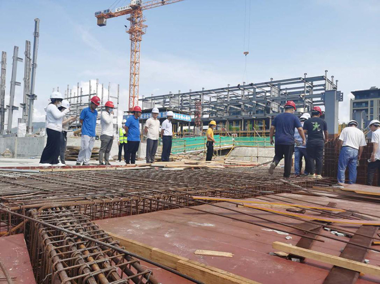 考察團(tuán)主要參觀了主體結(jié)構(gòu)已經(jīng)施工的19#樓~22#樓。參觀過(guò)程中提出了地下室柱腳與基礎(chǔ)筏板鋼筋連接處理節(jié)點(diǎn)問(wèn)題,鋼結(jié)構(gòu)安裝進(jìn)度及裝配率等問(wèn)題。隨后考察團(tuán)一行人到會(huì)議室與我司管理人員進(jìn)行深度交談。我司楊總和陳經(jīng)理一一介紹了本項(xiàng)目的規(guī)模和用鋼量,項(xiàng)目采用了我司專利-隱式鋼框架結(jié)構(gòu)體系,裝配率滿足政府申報(bào)裝配式住宅要求,并對(duì)構(gòu)件加工流程,進(jìn)場(chǎng)流程,安裝流程,驗(yàn)收流程,與土建工程施工工藝的對(duì)接合理安排,各節(jié)點(diǎn)問(wèn)題也做了詳細(xì)的說(shuō)明,同時(shí)所有鋼構(gòu)件由我司自有加工廠加工,能很好的控制項(xiàng)目成本及質(zhì)量。