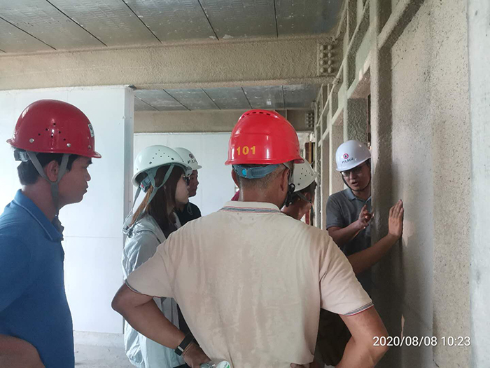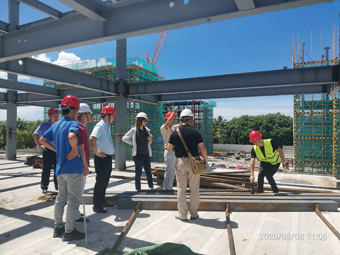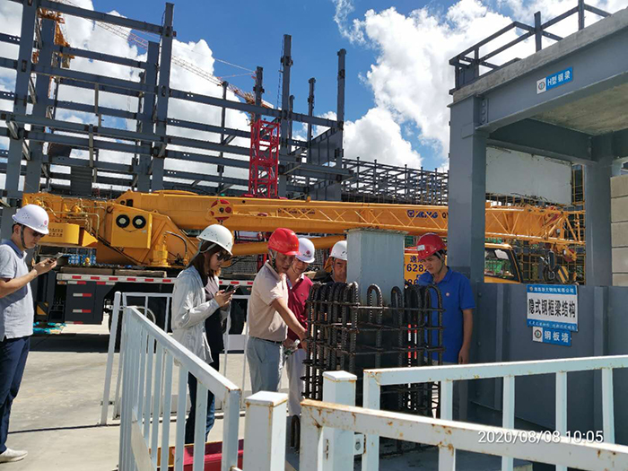 在施工現場,雙方就工程防腐防火要求、鋼柱鋼梁防火涂料、內隔墻ALC墻板、樓承板鋪設工藝、主體鋼柱、鋼梁焊接工藝等進行了深入交流。改進后的不落地支撐體系,能有效的縮減施工版面的移交時間,加快主體安裝進度;高標準的鋼柱校正測量要求,大大減少了現場螺栓擴孔率,保證了主體質量。