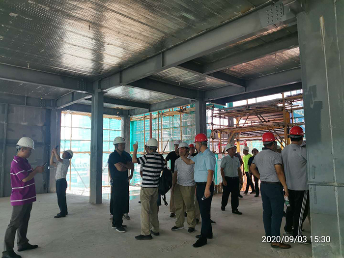 考察團(tuán)主要了解桁架樓承板的區(qū)別及使用部位、陽(yáng)臺(tái)及衛(wèi)生間縱向止水鋼板防滲漏、 鋼柱防火涂料與墻板的搭接節(jié)點(diǎn)處理等施工細(xì)節(jié),及ALC墻板的施工工藝。我司方總重點(diǎn)向考察團(tuán)介紹了本項(xiàng)目采用的鐵木辛柯-隱式鋼框架結(jié)構(gòu)體系,裝配率滿足政府申報(bào)裝配式住宅要求,且具有無(wú)凸梁凸柱、空間利用率高、得房率高的優(yōu)勢(shì)。