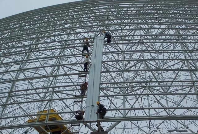 放線、驗線 → 安裝下弦平面網(wǎng)絡(luò) →安裝上弦倒三角網(wǎng)絡(luò)→安裝下弦正三角網(wǎng)絡(luò)→調(diào)整、緊固 → 安裝屋面帽頭→支座焊接、驗收