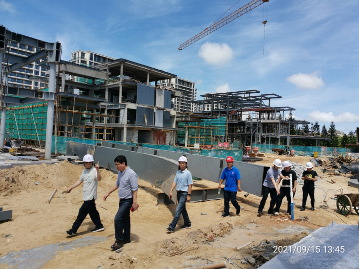 2021年9月15日中午,中陽建設(shè)集團(tuán)副總裁朱旻、副總裁吳軼強(qiáng)、總工程師陳偉、江西省建材院院長宋冬生、鐵木辛柯設(shè)計(jì)事務(wù)所王彥超博士一行蒞臨我司承建施工的海南綠城藍(lán)灣小鎮(zhèn)香樟苑、紫荊苑、云棲居、小鎮(zhèn)中心鋼結(jié)構(gòu)裝配式住宅項(xiàng)目調(diào)研考察,我司項(xiàng)目經(jīng)理駱明松、周杰陪同。