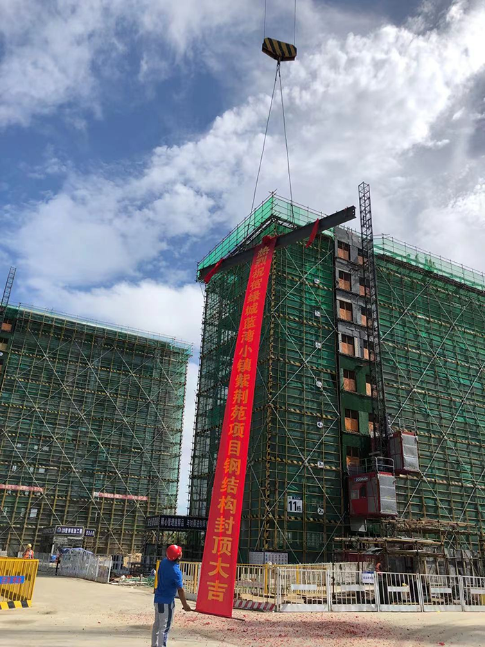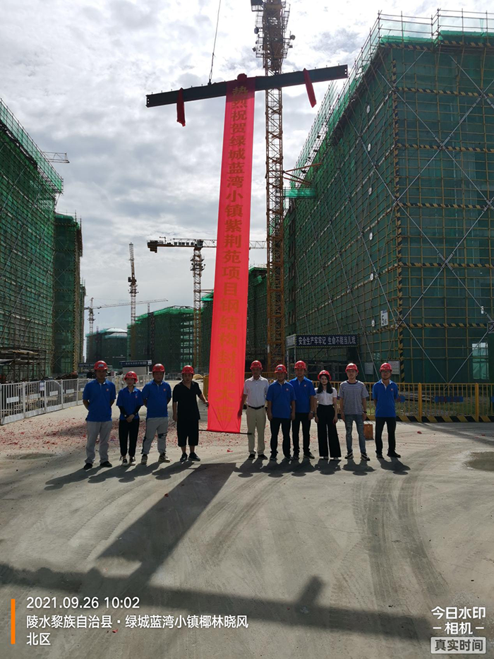 由海南浙大鋼構(gòu)有限公司承建的繼香樟苑后又一個組團(tuán)-陵水綠城藍(lán)灣小鎮(zhèn)紫荊苑裝配式鋼結(jié)構(gòu)住宅項目于2021年9月26日上午10:00,在綠城陳海松總、黃建明總 ,江南監(jiān)理袁乃富總監(jiān)及我司方建平總、肖琦琛總、駱明松項目經(jīng)理等共同見證下順利舉行封頂儀式。