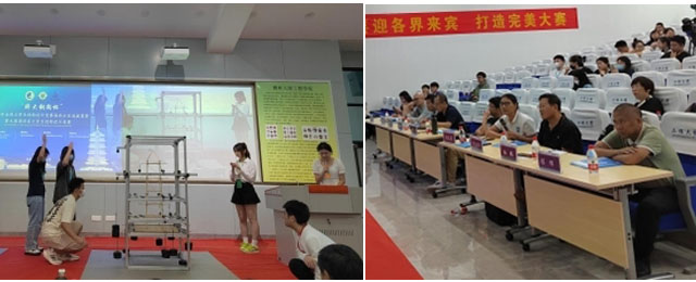 本賽題以應(yīng)縣木塔為背景,以三重木塔結(jié)構(gòu)為基本單元,讓參賽者針對多種荷載工況下的空間結(jié)構(gòu)制作帶挑檐加載點(diǎn)的三層木塔結(jié)構(gòu)。經(jīng)過共計16個小時的模型制作,模型加載暨決賽于3日在海經(jīng)院工程樓副樓F101進(jìn)行,參賽現(xiàn)場井然有序,各參賽者在主持人播報序號和志愿者指引下帶模型到加載區(qū)進(jìn)行安裝、加載。由國內(nèi)業(yè)內(nèi)專家和各參賽高校結(jié)構(gòu)專業(yè)高級職稱教師代表組成現(xiàn)場評審專家委員會進(jìn)行提問、評分。