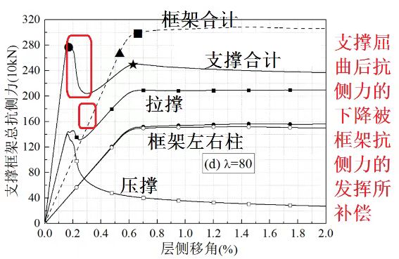 圖2 框架50%支撐50%,長(zhǎng)細(xì)比80時(shí)(各構(gòu)件對(duì)抗側(cè)力的貢獻(xiàn)拆分出來(lái)看)