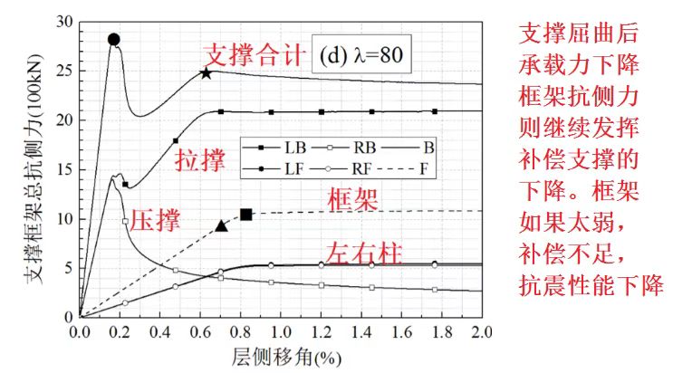 圖4 框架25%支撐75%,長(zhǎng)細(xì)比80時(shí)(各構(gòu)件對(duì)抗側(cè)力的貢獻(xiàn)拆分出來(lái)看)