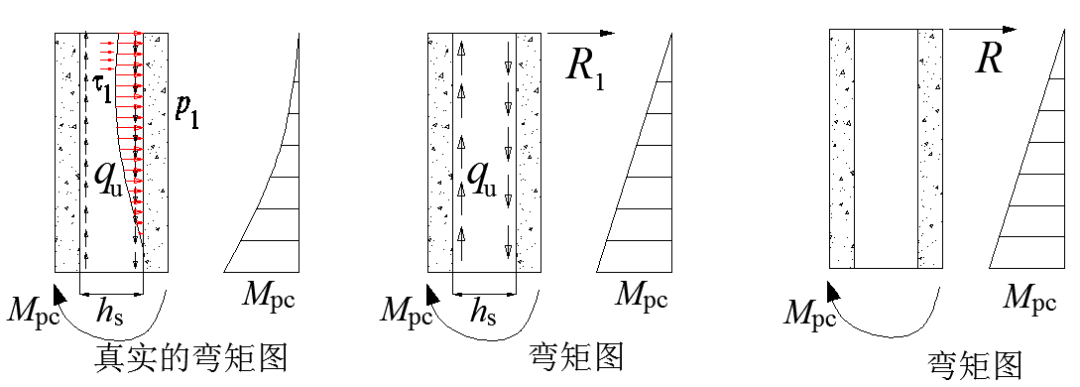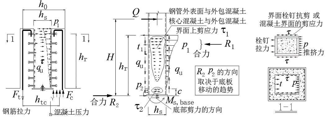 圖2中,界面上其他的力是水平方向的,這些力代表了外包層是混凝土的支座,水平力傳給了混凝土,外包混凝土的水平截面內(nèi)的剪力即來自這些界面水平作用力。