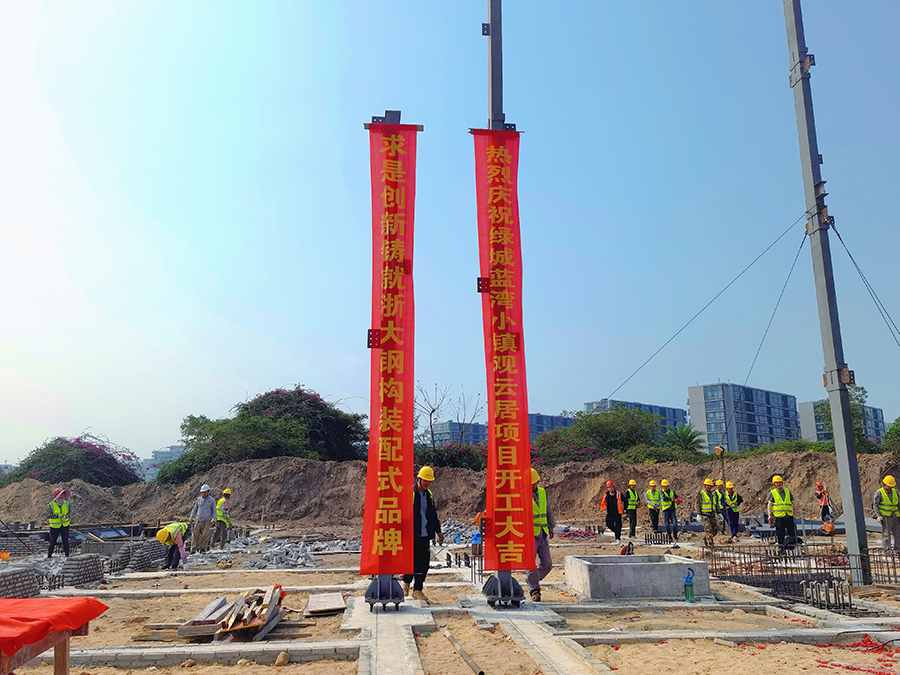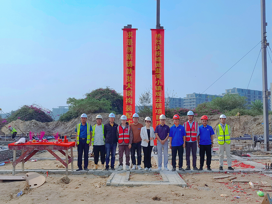 2023年2月25日上午10點08分,在甲方、監(jiān)理等領(lǐng)導的共同見證下,由浙大鋼構(gòu)承建的海南綠城藍灣小鎮(zhèn)繼2019年開工的香樟苑項目以來,第六個鋼結(jié)構(gòu)裝配式高端住宅項目——觀云居鋼結(jié)構(gòu)工程項目首根鋼柱吊裝順利完成,開工儀式圓滿舉行,項目宣告正式進入鋼結(jié)構(gòu)主體施工階段。