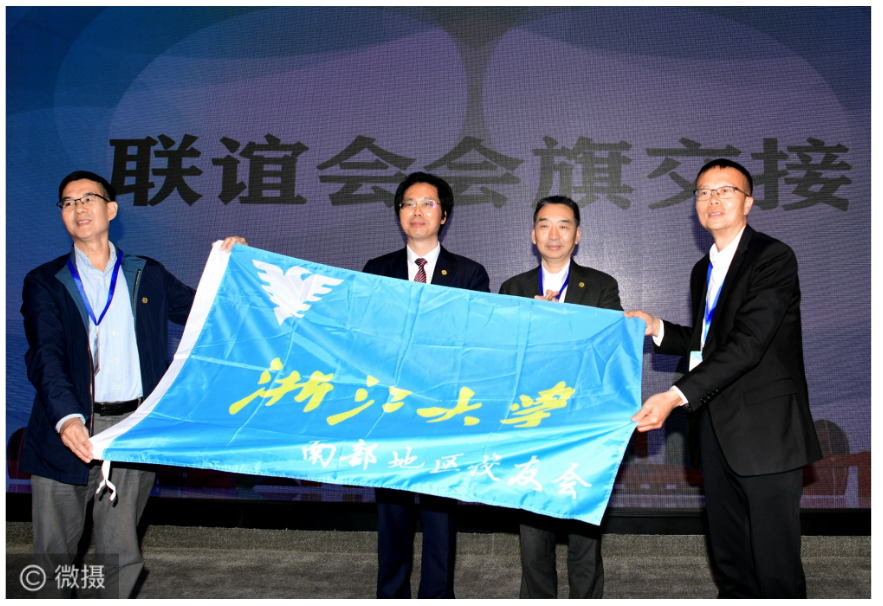 聯(lián)誼會舉行會旗交接儀式。浙江大學(xué)海南校友會會長胡國梁將會旗交給浙江大學(xué)佛山校友會會長陳志濤。