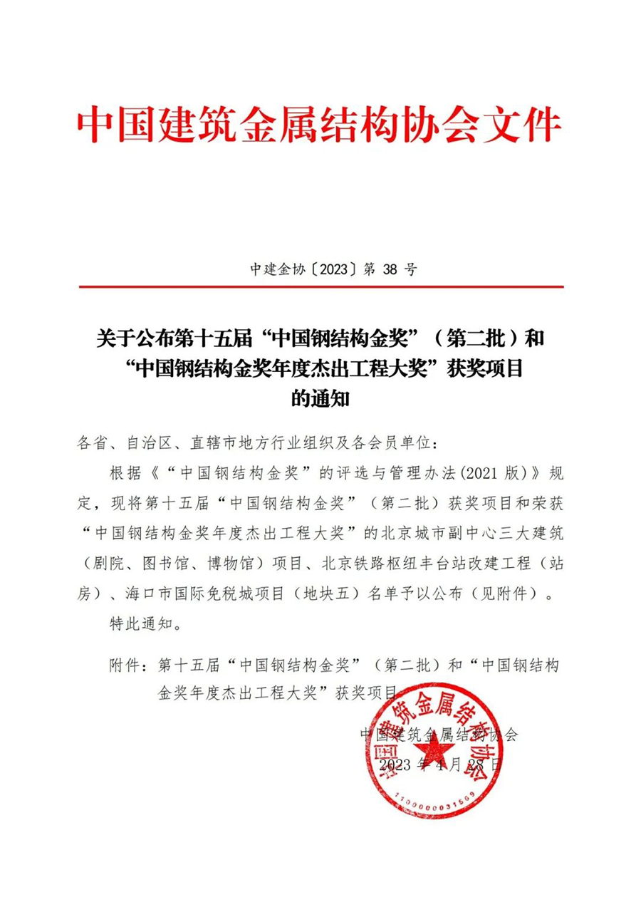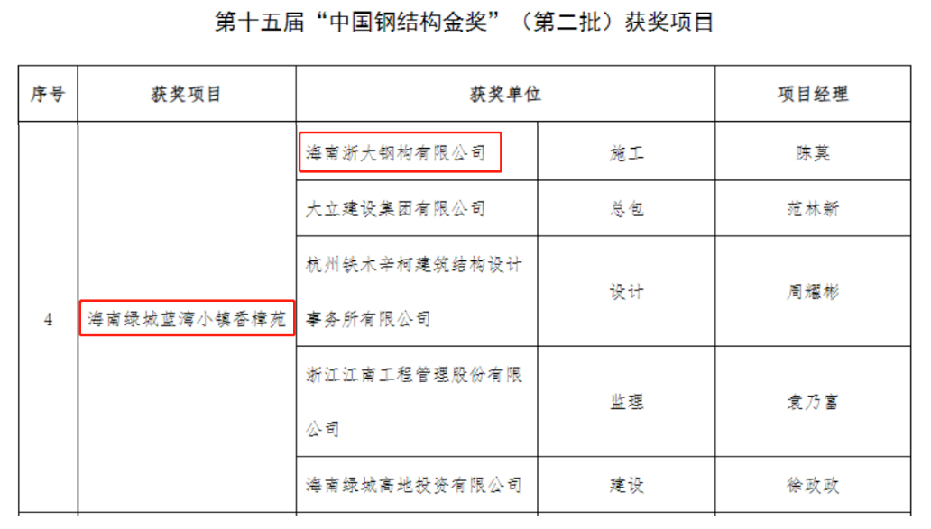 近日,中國建筑金屬結(jié)構(gòu)協(xié)會公布第十五屆“中國鋼結(jié)構(gòu)金獎”(第二批)獲獎項目名單。由海南浙大鋼構(gòu)有限公司承建的海南綠城藍(lán)灣小鎮(zhèn)香樟苑項目榮獲“中國鋼結(jié)構(gòu)金獎”!爸袊摻Y(jié)構(gòu)金獎”作為全國性的評比達(dá)標(biāo)表彰保留項目,是我國鋼結(jié)構(gòu)行業(yè)工程質(zhì)量最高獎項,代表我國鋼結(jié)構(gòu)工程質(zhì)量領(lǐng)先水平。